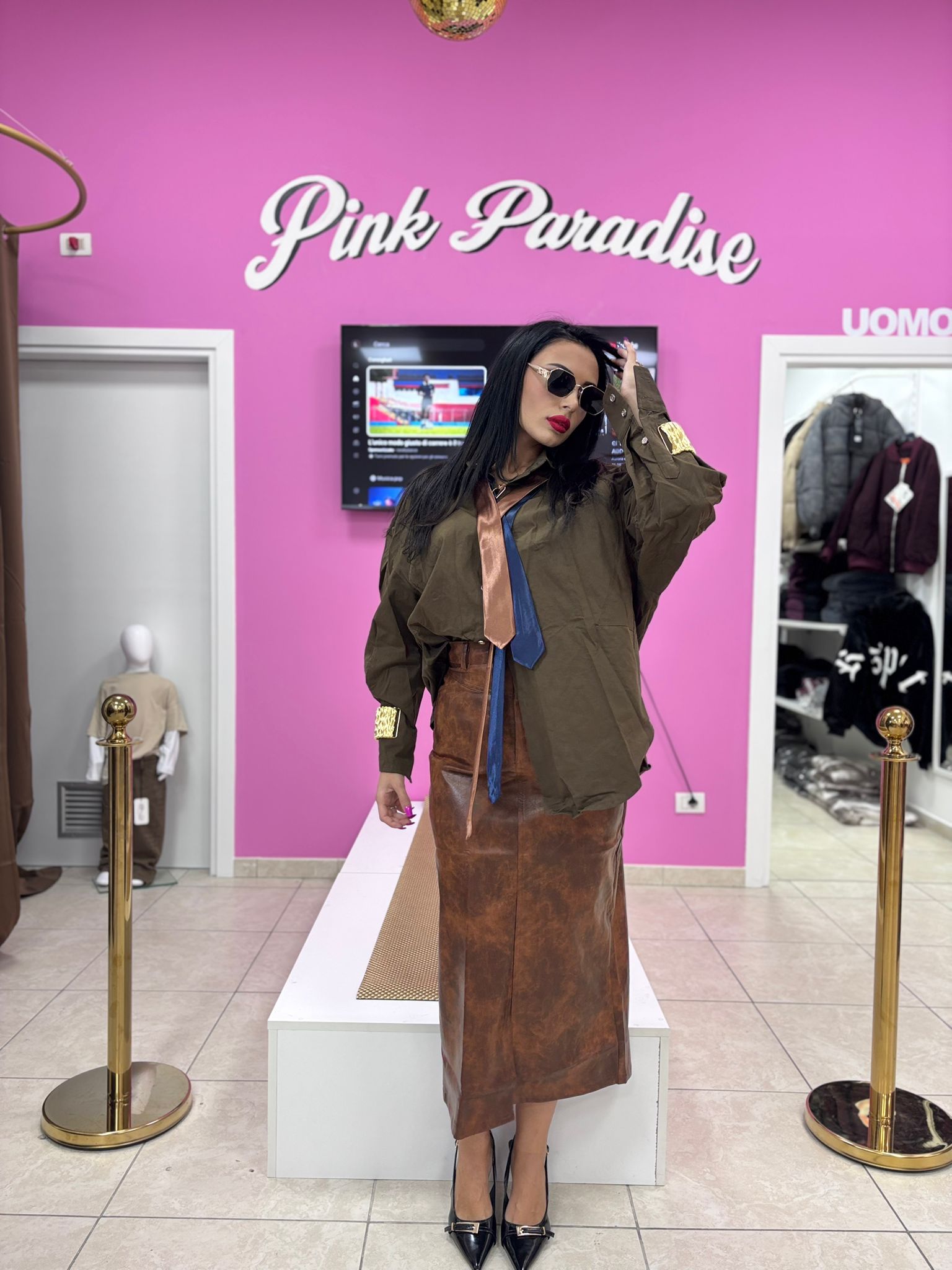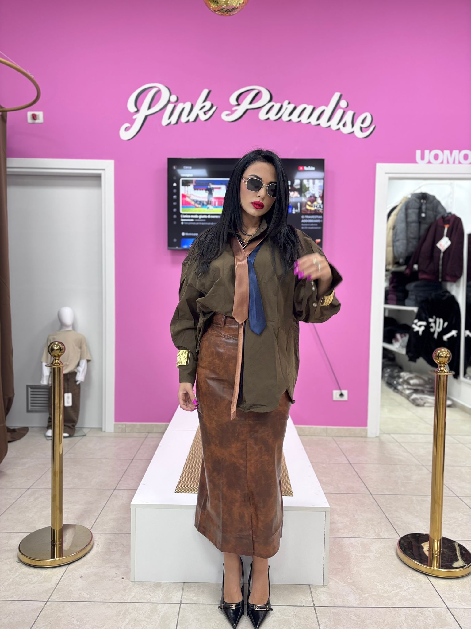 Elegante gonna dal taglio a tubino in un ricco colore marrone bruciato o cuoio. Il tessuto ha un distintivo aspetto similpelle con una finitura craquelé che aggiunge profondità e texture. La linea è aderente e dritta, arrivando a metà polpaccio, ideale per un look sofisticato e di tendenza che cattura l'attenzione.